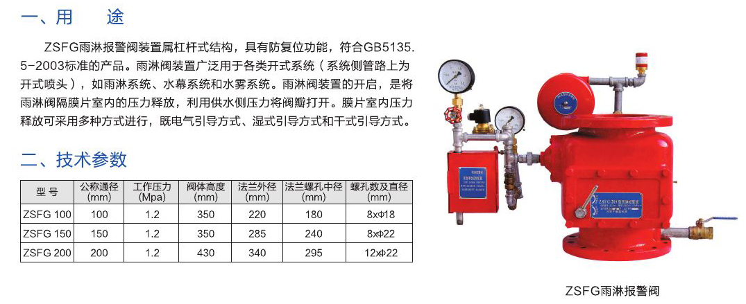 - ZSFG雨淋報警閥裝置屬杠桿式結(jié)構(gòu),具有防復(fù)位功能,符合GB5135.5-2003標(biāo)準(zhǔn)的產(chǎn)品。雨淋閥裝置廣泛用于各類開式系統(tǒng),如雨淋系統(tǒng)、水幕系統(tǒng)和水霧系統(tǒng)。