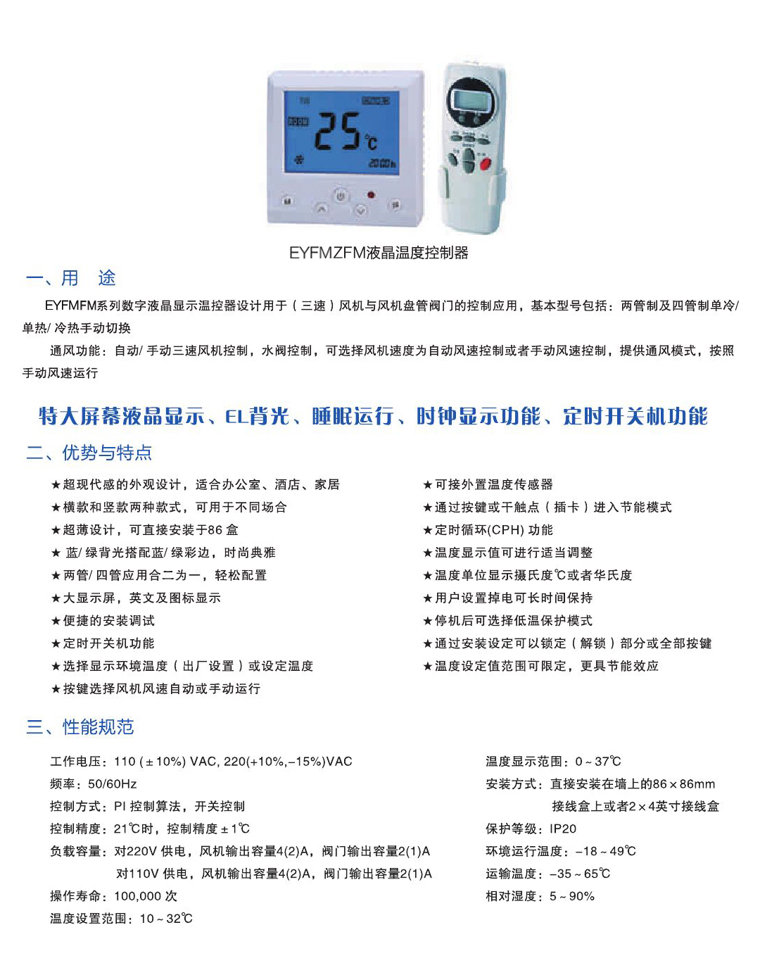 - LGDZFM系列數(shù)字液晶顯示溫控器設(shè)計用于(三速)風(fēng)機(jī)與風(fēng)機(jī)盤管閥門的控制應(yīng)用,基本型號包括:兩管制及四管制單冷/單熱/冷熱手動切換