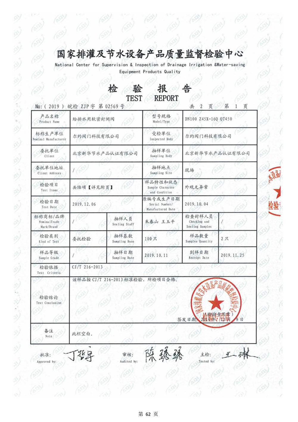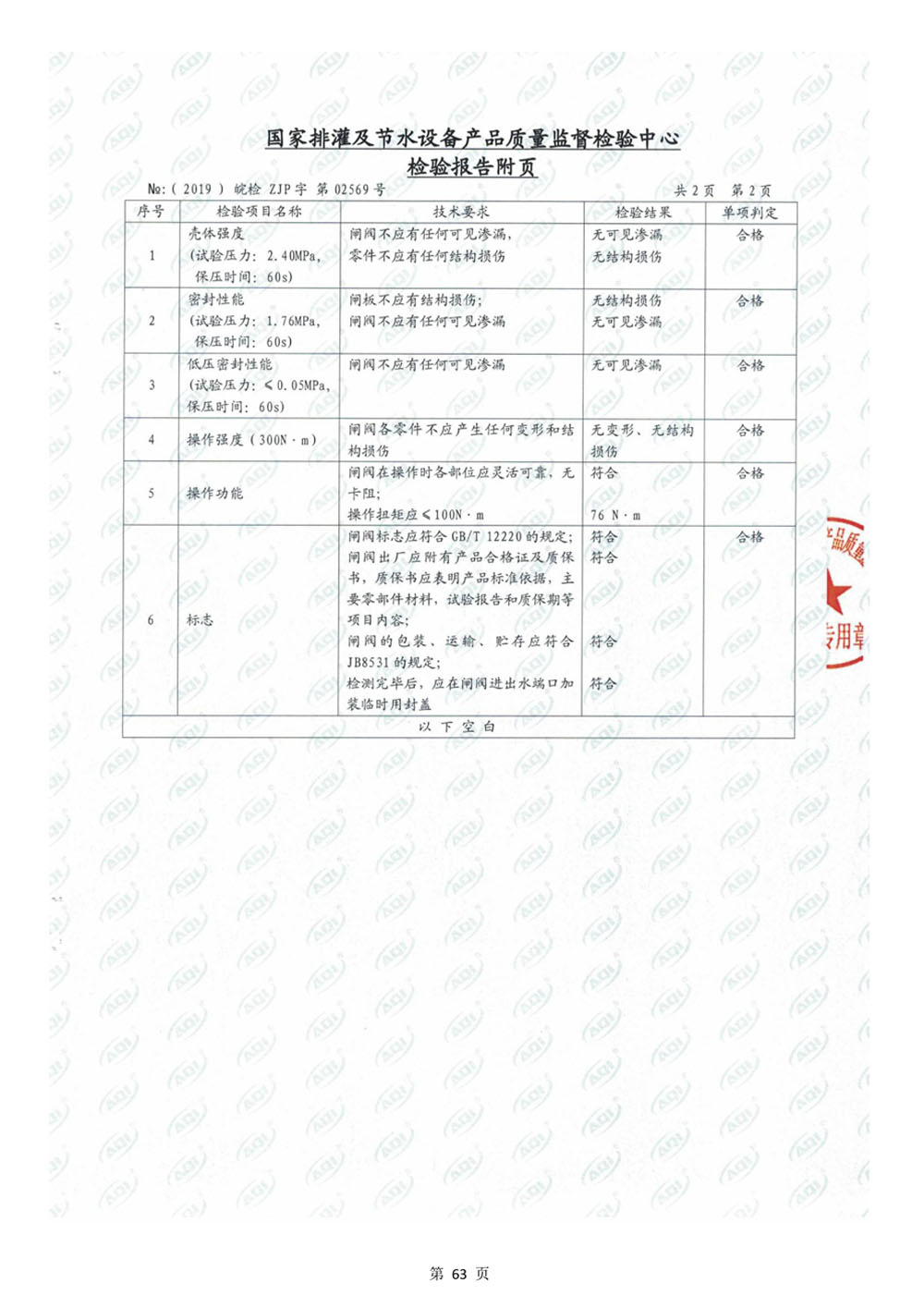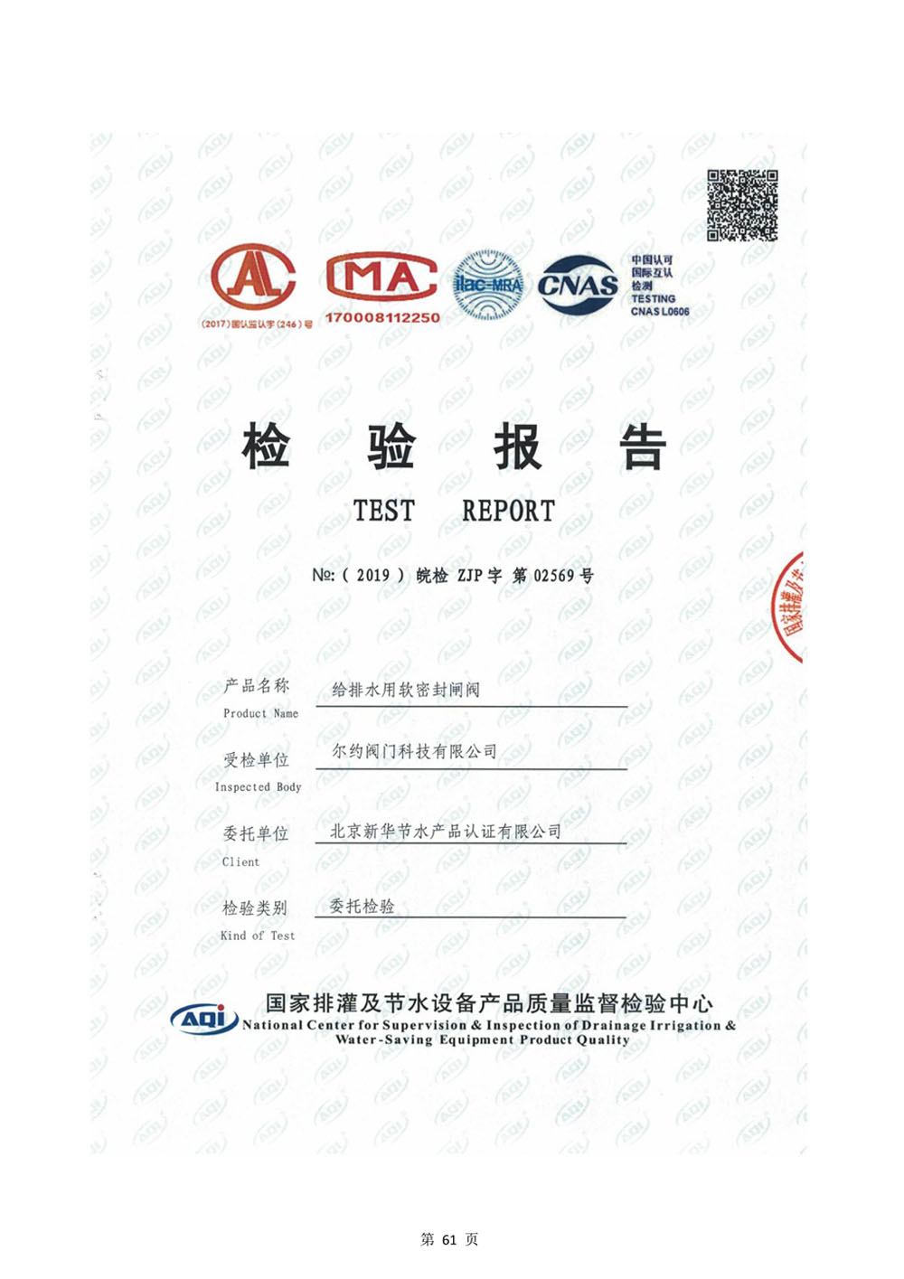給排水用軟密封閘閥檢驗報告