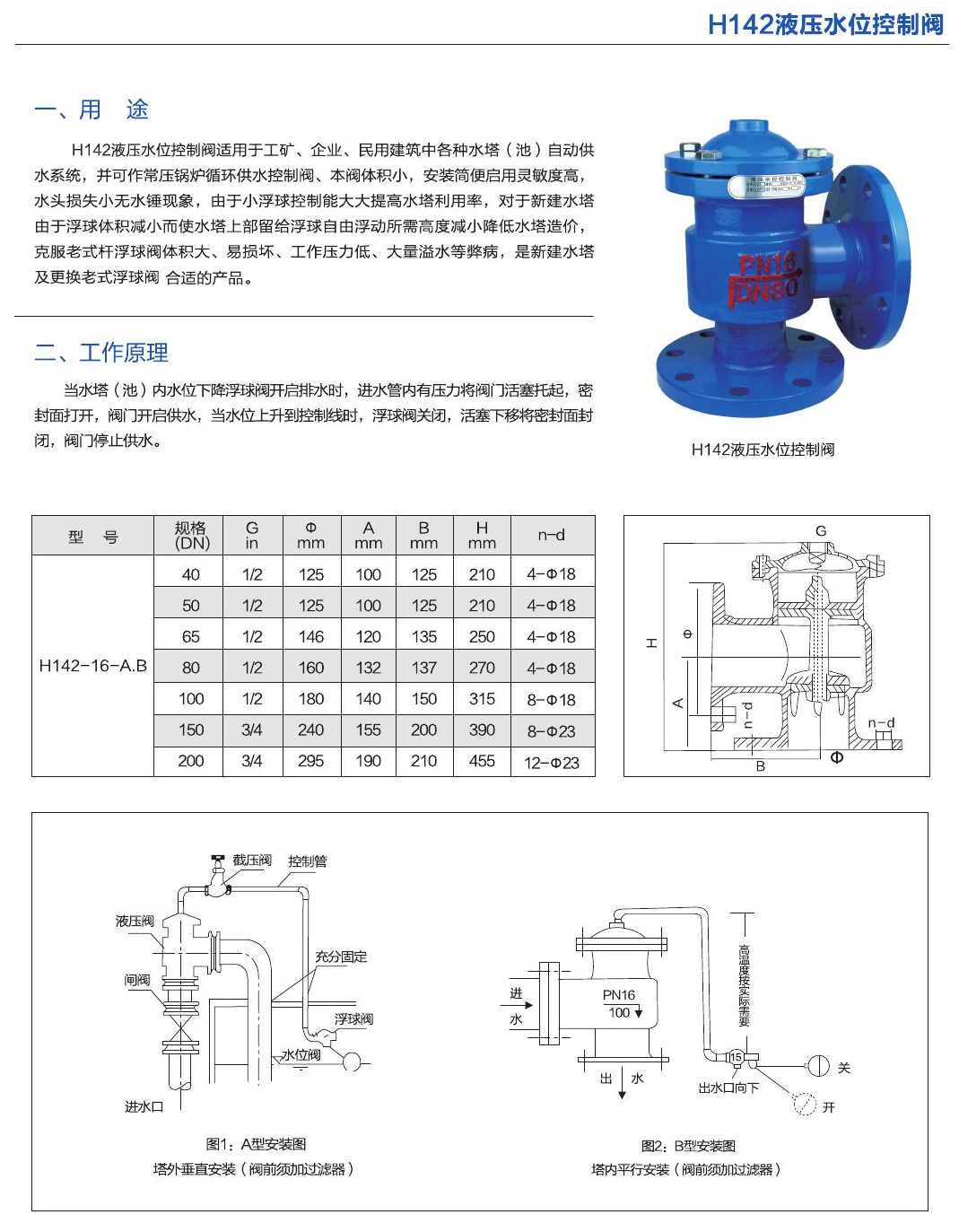 H142液壓水位控制閥適用于工礦、企業、民用建筑中各種水塔(池)自動供水系統,并可作常壓鍋爐循環供水控制區閥、體閥體積小,安裝簡便啟用靈敏度高,水頭損失小無水錘現象。