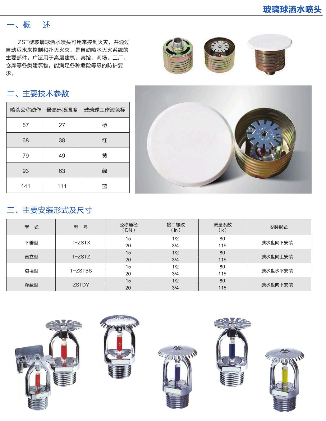 - ZST型玻璃灑水噴頭可用來(lái)控制火災(zāi),并通過自動(dòng)灑水來(lái)控制和撲滅火災(zāi),是自動(dòng)噴水滅火系統(tǒng)的主要部件,廣泛用于高層建筑、賓館、商場(chǎng)、工廠、倉(cāng)庫(kù)等各類建筑物,能滿足各種危險(xiǎn)等級(jí)的防護(hù)要求。