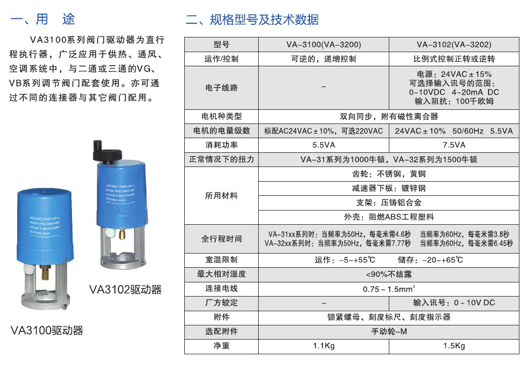 VA3100系列閥門驅(qū)動(dòng)器為直行程掃行器,廣泛應(yīng)用于供熱、通風(fēng)、空調(diào)系統(tǒng)中,與二通或三通的VG、VB系列調(diào)節(jié)閥門配套使用。